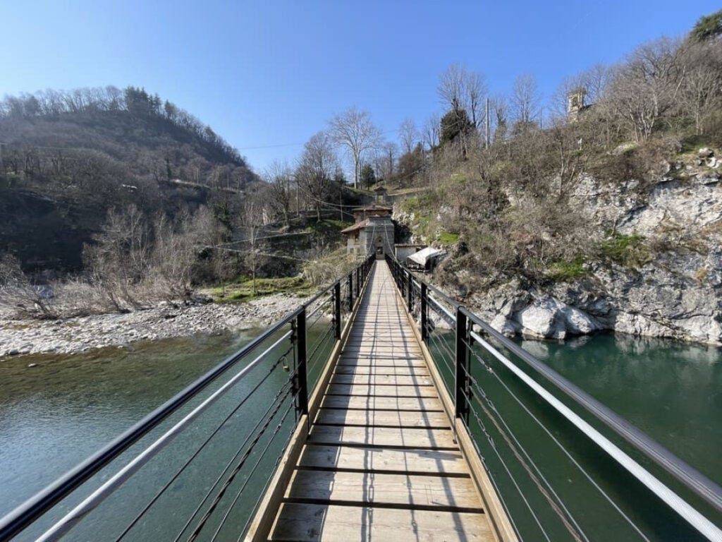 In discesa si arriva a Villa d’Almè, ottimo punto di ristoro, e alla stazione tramviaria, snodo della Ciclovia della Val Brembana. Una deviazione verso nord porta al suggestivo borgo di Clanezzo, con il ponte medievale e il ponte di corda.